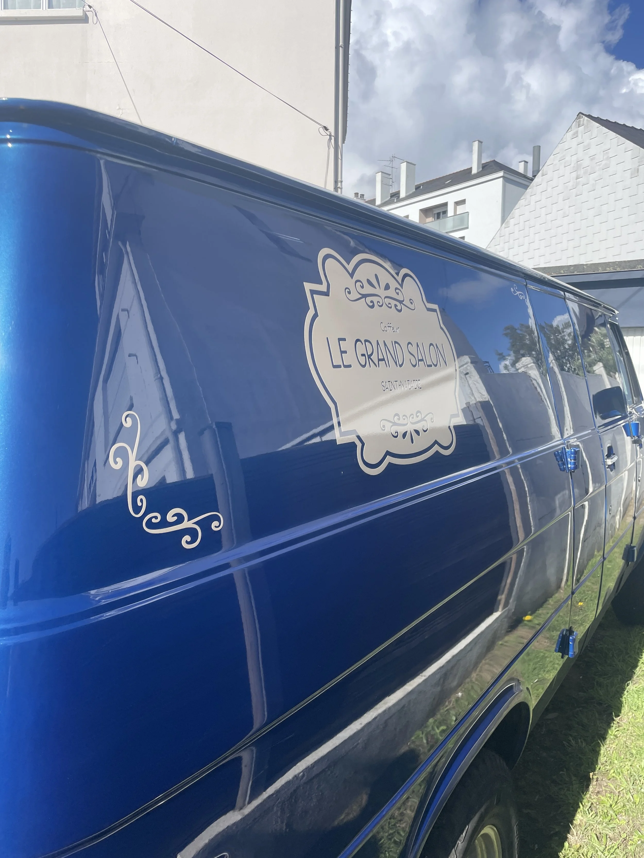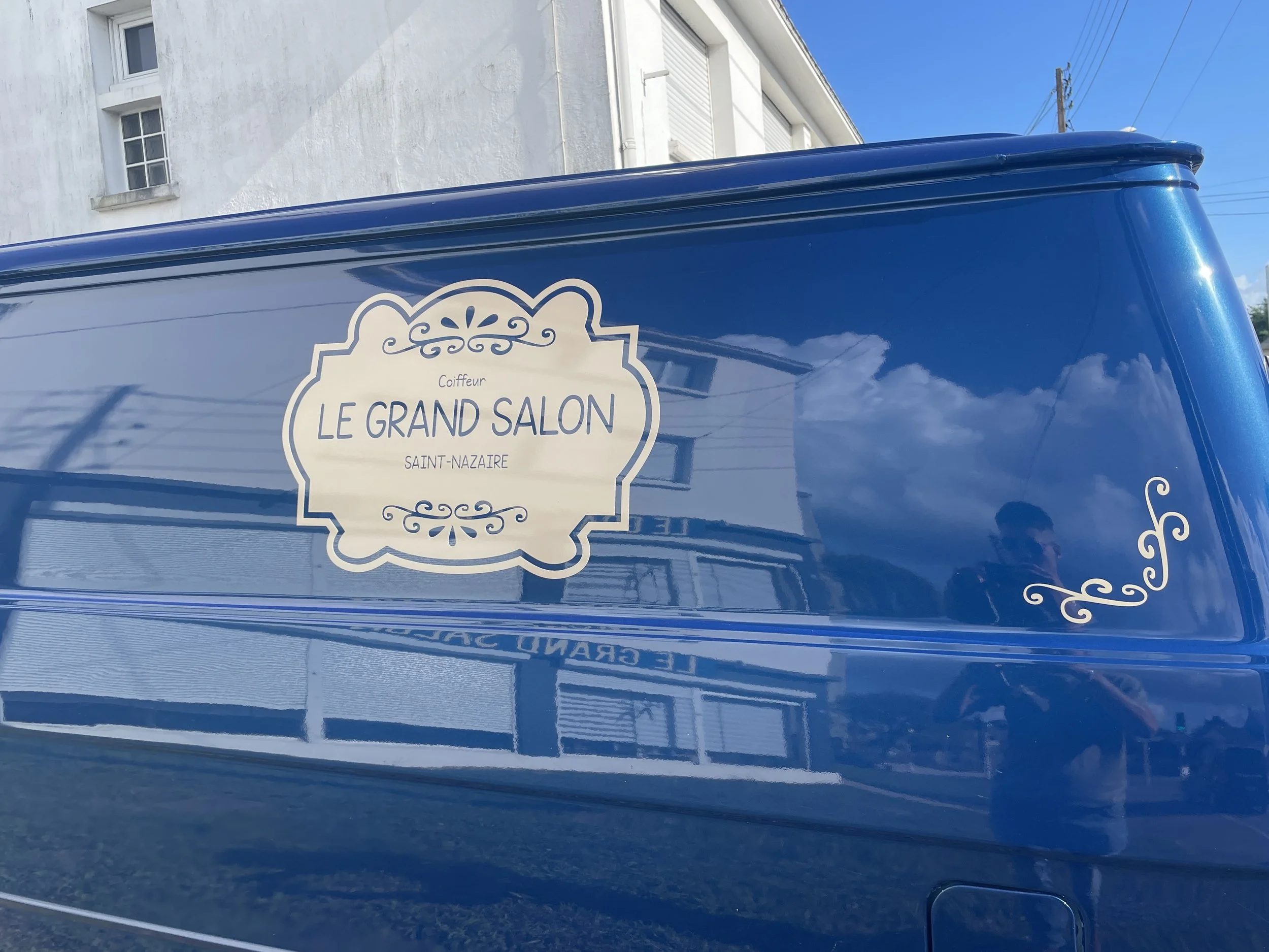 Réalisation d’un habillage adhésif sur un van vintage pour Le Grand Salon à Saint-Nazaire. Un design élégant et authentique qui reflète l’identité du client tout en offrant une visibilité unique sur la route.